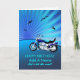 Feliz cartão de aniversário com uma moto. Uma carta perfeita para um motociclista. Uma moto azul com um pôr do sol estilizado e aves voadoras. Qualquer entusiasta de bicicleta vai adorar ter uma carta como esta. Adicione um nome para personalizar este cartão. Personalize-o com qualquer nome!