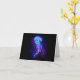 Água-viva grande, azul, desenhada artisticamente, brilhante, brilhante, com longos tentáculos sobre fundo preto com bioluminescência roxa. Água-viva luminosa.