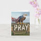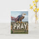 Uma águia careca enfiada em uma bandeira americana é tocada em uma placa de madeira rústica que lê "PRAY" decorada com folhagem verde