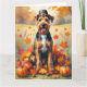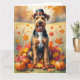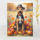 Uma pintura em forma de aquarela de um cão alegre sentado em meio a uma pilha de folhas vibrantes de queda, cercado por pequenas abóboras e bolotas espalhadas. O cachorro veste um chapéu de peregrino e fede de alegria, capturando o espírito da Ação de Graças. No fundo, campos de colheita suaves e árvores abrigadas em ouro criam um ambiente rural pacífico. Texturas gentis e tons de outono aquecidos dão à cena uma sensação acolhedora e nostálgica de celebrar a beleza da estação.