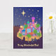 Um cartão de Natal alegre para um Pai Maravilhoso, com um céu estrelado, os três sábios em seus camelos à distância, e Joseph, Mary e um fazer burro se dirigem para a cidade colorida de Belém. As letras, a Alegria de Natal e as estrelas estão pintadas com efeito ouro (e não com folha de ouro). Um design midiático de Judy Adamson.