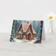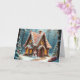 Uma casa de gengibre baleada fica presa em uma floresta nevada, enfeitada com canas doces e detalhes complexos de gelo. O texto do dentro pode ser alterado.