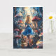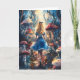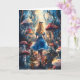 Uma design de aquarela branca com Alice caminhando por um caminho de floresta revestido com cogumelos bonés vermelhos, capturando o charme mágico da Terra Maravilha.