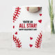This greeting card mixes baseball and Valentine’s Day in a fun, heartfelt way ❤️💌. In the center on a white background, it says “YOU’RE AN ALL STAR! HAPPY VALENTINE’S DAY!” in big, easy-to-read letters. The main text is in black, with red used to highlight parts of the message, and it sits right in the middle of the card. Along the top edge, a real-looking baseball peeks into the scene, showing its red stitching and hinting at the sport theme. On the left and bottom edges, red felt pieces are cut into stitch-like shapes, framing the message like baseball seams. Small red heart cutouts are scattered around those felt stitches, adding a sweet touch that fits the holiday 🍫.