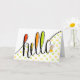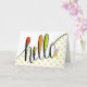 Este é um cartão bonito com a palavra "olá" escrita à mão e um pequeno ilustre que está acenando. O rato está a guardar alguns shorts amarelos e laranja com chave, e óculos vermelhos. Uma maneira divertida de alcançar amigos e familiares. Design de Natalie Kinnear