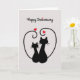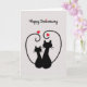 Uma saudação de aniversário doce com dois gatos pretos com caudas longas formando um coração, acentuada com dois corações vermelhos em um fundo cinza e branco com bolinhas. A letra "i" em aniversário é pontilhada com um coração vermelho.