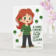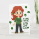 Este cartão apresenta uma menina de cabelos ruivos e olhos esmeralda com um sorriso de boca aberta, em pé à esquerda como se tivesse acabado de se virar para um amigo próximo. Seus cabelos ruivos caem em curvas suaves, e um trevo de quatro folhas está enfiado atrás da orelha como um doce aceno para alguém especial ☘️. Ela usa uma camisa listrada horizontalmente em tons de verde, contra um fundo branco brilhante salpicado de pequenos trevos verde-escuros. A cena parece amigável e um pouco romântica de uma maneira suave, como o sorriso que você compartilha quando está por dentro de um segredo sortudo 💚. No lado direito, letras verdes são empilhadas em linhas claras e leem: “UM BOM AMIGO É COMO UM TREVO DE QUATRO FOLHAS.” O texto se assenta confortavelmente no espaço aberto, equilibrando a figura e atraindo o olhar para a página. Trevos espalhados pontilham o fundo em torno da