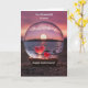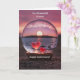 Um cartão de aniversário de casamento para alguns amigos! Dois corações num globo numa costa com o pôr do sol e um céu rosa.