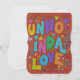 O cartão de saudação exibe a mensagem "Amor Incondicional" em um espectro de cores. Cada letra explode com uma tonalidade vibrante diferente, criando uma mensagem alegre e elevadora. O fundo é simples e elegante, permitindo que o texto multicolorido seja o ponto focal.