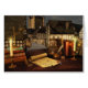 A surreal 3D play on perspective created in Vue. In the background is a quiet medieval city street in late afternoon, the warm glow of the setting sun enhanced by the lamps burning along the walls. Half-timbered houses and inns with thatched roofs line the street, and behind them is visible against the sky a tall, square tower with four corner turrets. This large-scale scene merges into a smaller foreground still life showing a desk littered with books. The books are as tall as the stone wall and houses they lean against, and the cobblestone street fades smoothly into the wood grain of the table. In addition to the books there sits on the desk a feather pen and ink bottle, a compass, an hourglass, a mounted magnifying glass, and a parchment letter with an official seal. Two candles light the desk with a soft glow as the lamps light the street.