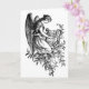 vintage drawing of an angel playing the harp surrounded by leaves. beautiful black and white illustration of angelic figure kneeling on a leafy ground and a musical instrument.