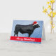 Uma foto de um touro negro de Angus vestindo um chapéu de Papai Noel sobre fundo de neve é perfeita para o criador de Angus.