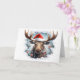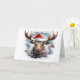 Dê ao seu Natal um toque selvagem com este retrato de animais de Natal fofo com um alce de Natal usando um chapéu de Papai Noel na frente, fundo de flocos de neve azuis no interior e uma doce saudação de "Feliz Natal" em uma fonte nevada no interior. Cartão de Natal perfeito para amantes de animais e vida selvagem! Apenas da Yips N' Howls.