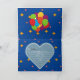Um cartão de aniversário azul com balões e design de presentes de Bolo parece bonito. Feliz cartão de cumprimentos de aniversário para crianças.