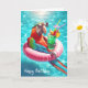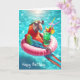 Uma arara está soltando sobre um anel inflável rosa em uma piscina azul cintilante vestindo óculos escuros e desfrutando de um coquetel O texto é editável.