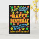 Um cartão de aniversário muito brilhante e colorido para qualquer idade, com um toque vintage e mensagens positivas, como 'A idade é apenas um número!' e 'Você é tão jovem quanto se sente!', tudo em um fundo preto, pontilhado com números e estrelas. Um design digital de Judy Adamson.