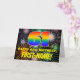 A frente deste design de cartão de saudação com temas de aniversário, que chama a atenção e ganha destaque, apresenta um grande número "61" com um padrão de gradação inspirado no espectro multicolorido do arco-íris, juntamente com a mensagem "HAPPY 61ruas BIRTHDAY", e um nome de destinatário personalizado. O fundo da frente tem um padrão alegre e colorido inspirado em fogos de artifício comemorativos em explosão. O dentro apresenta uma mensagem de saudação de aniversário personalizada, ou talvez possa ser apagado e deixado vazio se uma mensagem for escrita manualmente. Um cartão de cumprimentos de aniversário vibrante e personalizado como este pode ser usado para celebrar o sexagésimo primeiro aniversário de alguém. [~Z0000619]