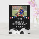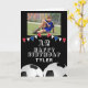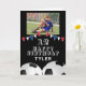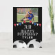 A Bola de Futebol Flags Black Photo Birthday Card. O design tem duas bolas de futebol e bandeiras de revestimento de festa de aniversário em cores vermelha, azul e branca em preto. Adicione sua foto e personalize-a com seu nome, idade e texto. Excelente para rapazes e raparigas que adoram futebol, futebol.