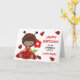 Este cartão de aniversário bonito apresenta uma adorável menina africana americana vestida com um vestido de bolinhas vermelha e preta e vestindo antenas de joaninha. Pequenos insetos de bolinhas e uma flor vermelha brilhante estão ao seu lado. Seu texto personalizado está em vermelho e preto no lado. O dentro tem outra flor, mais insetos de dama, e outro campo de texto personalizado. Adorável! Gráficos por Prettygrafik Design, © Prettygrafik.com