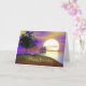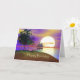 Um cartão de aniversário com a minha obra de arte original de uma cena pacífica com um veleiro navegando por uma ilha tropical e um sol. O texto do cobrir que diz "Parabéns" e o dentro verso são personalizáveis.