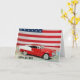 O velho carro de Chevy, vermelho e branco, de 1955, num mapa de estradas com bandeira americana para aniversário. O texto é editável.