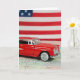O velho carro de Chevy, vermelho e branco, de 1955, num mapa de estradas com bandeira americana para aniversário.