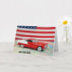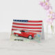 O velho carro de Chevy, vermelho e branco, de 1955, num mapa de estrada com uma bandeira americana de aniversário. O texto é editável.