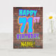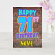 A frente deste design de cartão de saudação temático de aniversário divertido apresenta a mensagem "FELIZ 71RUAS ANIVERSÁRIO", tendo um olhar vibrante, colorido e inspirado no grafite, junto com um nome de destinatário personalizado. O fundo da frente apresenta um padrão inspirado pela aparência de uma parede de tijolos. O dentro tem uma mensagem de saudação de aniversário personalizada, ou talvez pudesse ser apagado e deixado vazio se uma mensagem fosse escrita manualmente. Um cartão de cumprimentos de aniversário divertido e personalizado como este pode ser enviado para celebrar o setenta e um anos de alguém. [~Z0000531]