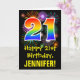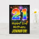 A frente deste design de saudação de aniversário empolgante, divertida e colorida apresenta um grande número "21" com um padrão inspirado no gradiente do espectro arco-íris, juntamente com a mensagem "Happy aniversário de 21 anos", e um nome de destinatário personalizado. A frente também tem um padrão de fundo colorido inspirado pela aparência de fogos de artifício comemorativos em explosão. O dentro apresenta uma mensagem de saudação de aniversário personalizável, ou talvez possa ser apagado e deixado o vazio se uma mensagem for escrita manualmente. Um cartão de aniversário personalizável como este pode ser uma maneira divertida de enviar uma mensagem para celebrar o vigésimo primeiro aniversário de alguém. [~Z0000442]
