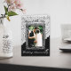 Recorte de renda branca e fundo preto com moldura preta e prata. Acento de anéis de prata. Interior: Texto e 2ª foto também elegantemente emoldurada. *Texto personalizável. Por favor, use os modelos à direita para sua conveniência.