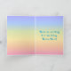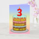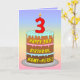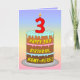 Este design de cartão de saudação de aniversário alegre e colorido apresenta uma representação em estilo cartoon de um bolo de aniversário de três níveis com uma vela em forma numérica no topo mostrando o número "3", juntamente com a mensagem "ANIVERSÁRIO DE 3 ANOS FELIZ", e um nome de destinatário personalizável. O fundo da frente tem um espectro de gradiente de vários cores do arco-íris pastel inspirado em gradiente. O dentro apresenta uma mensagem de saudação de aniversário personalizada, ou talvez possa ser apagado e deixado o vazio se uma mensagem for escrita manualmente. Um cartão de saudação de aniversário divertido e personalizado como este pode ser uma maneira divertida de enviar alguns desejos de aniversário a alguém que está celebrando seu terceiro aniversário. [~Z0000625]