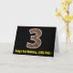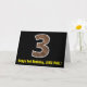A frente deste design de cartões de saudação, tema de aniversário, rústico e divertido, apresenta um grande número "3", tendo um padrão de estilo falso de grão de madeira inspirado, junto com a mensagem "Happy aniversário de 3 anos," e um nome personalizado. O dentro apresenta uma mensagem de saudação de aniversário personalizada, ou talvez possa ser apagado e deixado vazio se uma mensagem for escrita manualmente. Um cartão de aniversário personalizado como este pode ser uma maneira divertida de enviar desejos de aniversário a alguém que comemora seu terceiro aniversário. [~Z0000431]