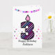 Um cartão aniversário de 3 anos cor-de-rosa e roxo para ela, que você pode personalizar com o nome dela. A frente desta placa de aniversário de 3 anos diversão para ela apresenta o número três em uma vela design com risca colorida. O pano de fundo tem um confete colorido espalhado à volta das três velas e acima tem uma feliz saudação de aniversário. A mensagem dentro pode ser facilmente personalizada se você quiser.