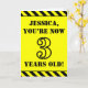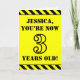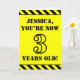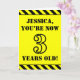 A frente deste design de cartão de saudação de aniversário com tema de diversão e atenção apresenta um nome personalizado e a mensagem "VOCÊ ESTÁ AGORA COM 3 ANOS!" em texto de estilo estêncil preto em um fundo amarelo. A parte frontal também apresenta um padrão de listras amarelas e pretas que se chama olho nas bordas superior e inferior. O dentro apresenta uma mensagem de saudação de aniversário personalizada, ou talvez possa ser apagado e deixado o vazio se uma mensagem for escrita manualmente. Um cartão de aniversário personalizado como este pode ser uma maneira divertida de enviar desejos de aniversário a alguém que comemora seu terceiro aniversário. [~Z0000413]