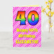 A frente deste design de cartão de saudação com tema aniversário de 40 anos feliz e divertido apresenta um grande número "40", tendo um padrão de gradação inspirado no espectro do arco-íris colorido. Ele também apresenta a mensagem "Happy aniversário de 40 anos,", seguida de um nome de destinatário personalizado. O fundo da frente apresenta um padrão de cor-de-rosa-escuro e faixas de rosa claro contendo formas cardíacas cor-de-rosa amorosas. O dentro apresenta uma mensagem de saudação de aniversário editável, ou talvez pudesse ser apagado e deixado o vazio se uma mensagem fosse escrita manualmente. Um cartão de aniversário personalizável como este pode ser uma maneira divertida de enviar uma mensagem para celebrar o quadragésimo aniversário de alguém. [~Z0000416]