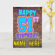 A frente deste design de cartão de saudação de aniversário divertido apresenta a mensagem "HAPPY 51RUA BIRTHDAY", tendo um olhar vibrante, colorido e inspirado no grafite, além de um nome de destinatário personalizado. O fundo da frente apresenta um padrão inspirado na parede do tijolo. O dentro tem uma mensagem de saudação de aniversário personalizada, ou talvez pudesse ser apagado e deixado vazio se uma mensagem fosse escrita manualmente. Um cartão de saudação de aniversário divertido e personalizado como este pode ser usado para reconhecer o cinquenta e um anos de alguém. [~Z0000531]