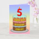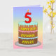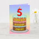 Este design de cartão de saudação de aniversário divertido e otimizado apresenta uma representação em estilo cartoon de um bolo de aniversário de três níveis, com uma vela em forma de número no topo, mostrando a idade "5", juntamente com a mensagem "FELIZ 5 BIRTHDAY", e um nome de destinatário editável. O fundo da frente tem um espectro de gradiente de vários cores do arco-íris pastel inspirado em gradiente. O dentro apresenta uma mensagem de saudação de aniversário editável, ou talvez pudesse ser apagado e deixado o vazio se uma mensagem fosse escrita manualmente. Um cartão de saudação de aniversário colorido e personalizado como este pode ser enviado para celebrar o quinto aniversário de alguém. [~Z0000625]