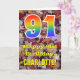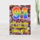 A frente desta colorida design de cartões de saudação de aniversário, com tema de outono, e inspirada na natureza apresenta um grande número de "91", tendo um padrão inspirado no espectro do arco-íris. Também apresenta a mensagem "Feliz aniversário do 91rua", e um nome personalizável. O fundo da frente do cartão apresenta um padrão rústico de folhas de outono. O dentro apresenta uma mensagem de saudação de aniversário personalizada, ou talvez possa ser apagado e deixado o vazio se uma mensagem for escrita manualmente. Um cartão de aniversário personalizado como este pode ser uma maneira divertida de enviar desejos de aniversário a alguém que comemora o seu nonagésimo primeiro aniversário. [~Z0000384]
