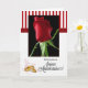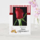 Uma única rosa vermelha sobre preto destaca-se contra o branco de linho macio e listras verticais vermelhas neste cartão de aniversário de casamento em francês.