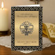 Celebre o aniversário / ordenação ao sacerdócio com esta bela imagem religiosa católica tradicional de um Cordeiro no Altar sobre um fundo dourado brilhante bordeado por um desenho preto e dourado. O texto e as fontes podem ser modificados.