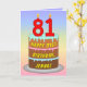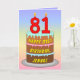 Este alegre e alegre design de cartão de saudação com tema de aniversário apresenta uma representação em estilo cartoon de um bolo de aniversário de três níveis com velas em forma de número no topo, mostrando a idade "81", juntamente com a mensagem "HAPPY 81RUA BIRTHDAY", e um nome de destinatário personalizado. O fundo da frente apresenta um espectro de arco-íris pastel de várias cores inspirado em um padrão de gradiente. O dentro tem uma mensagem de saudação de aniversário personalizada, ou talvez pudesse ser apagado e deixado vazio se uma mensagem fosse escrita manualmente. Um cartão de saudação de aniversário personalizado e otimista como este pode ser uma maneira divertida de enviar alguns desejos de aniversário a alguém que está celebrando seu oitenta e um anos. [~Z0000625]