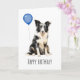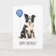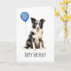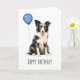 Cartão de aniversário adorável com um lindo Australian Shepherd preto e branco.