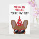Este engraçado cartão de aniversário de buldogue francês certamente coloca um sorriso na cara do aniversariante ou garota que tem senso de humor. A design apresenta uma ilustração de um legal cão francês, de cor vermelha, que veste um chapéu de partido vermelho e óculos de sol com a menção "Perdão, meu franqueado! Você é tão velho" escrito na frente. Este design também está disponível com diferentes Bulls franceses de cor diferente.
