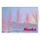 Pintura digital de pássaros cobertos por neve; a neve tingida de rosa pelo sol de fixação. A leitura de texto "Alaska" também é exibida. Aqui no norte é comum ver árvores cobertas de neve formigadas, rosa ou laranja, pelo sol pendurado no horizonte.