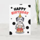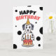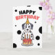 Um Dalmático próximo a um bolo de aniversário, ideal para um convite de aniversário ou saudação.