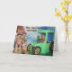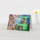 Este cartão apresenta recuperadores de ouros como agricultores. Um dirige o trator enquanto o outro raia o feno. O texto diz "Hay, Hay! É seu aniversário!" e "Espero que se divirta!".