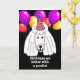 Os aniversários são melhores com um Poodle, saudação de papel com um poodle branco em preto com balões de aniversário e chapéu de festa. Arte, imagem e direitos de autor versos © Shoaff Ballanger Studios, 2022.