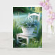 Uma cesta mais vadia cheia de delicadas flores azuis que me esquecem, não fica sentada em uma cadeira branca de madeira em um campo de verão para um aniversário. O texto é editável.
