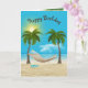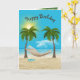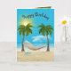 Hammock pendurado entre duas palmeiras com estrelas-do-mar e flip-flops na areia da praia do oceano com nuvens de verão. O texto pode ser editado.