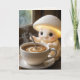 Uma criatura fofa, semelhante a cogumelo, com um boné brilhante, senta-se ao lado de uma xícara de café a vapor, agitando-a com uma colher. Todo o texto pode ser alterado.